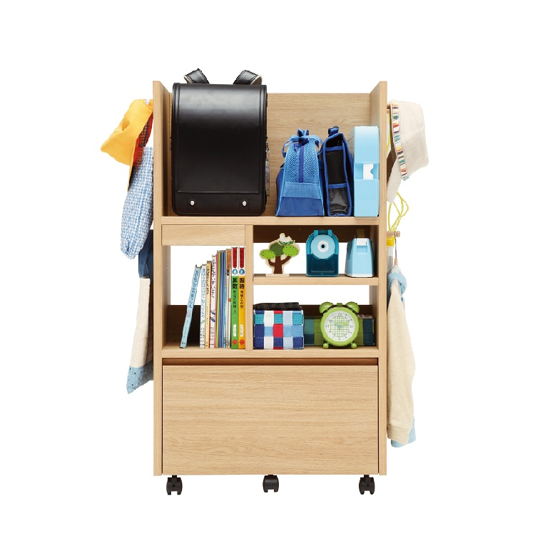 幅60cm・高さ107cmのスリム設計で、狭めの子ども部屋にも置きやすいマルチラック。引き出し・可動棚・木製フックが付いていて、ランドセルや教科書、文房具まできれいに整理できます。