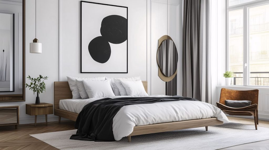 色がシンプルな分、素材感が重要。木目・ファブリック・レザーなどを取り入れることで、冷たすぎない空間になります。